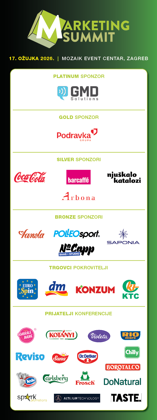 Marketing Summit pod jednim krovom okuplja domaće i međunarodne marketinške stručnjake koji s sudionicima dijele primjere dobre prakse i rezultate ekskluzivnih istraživanja tržišta.